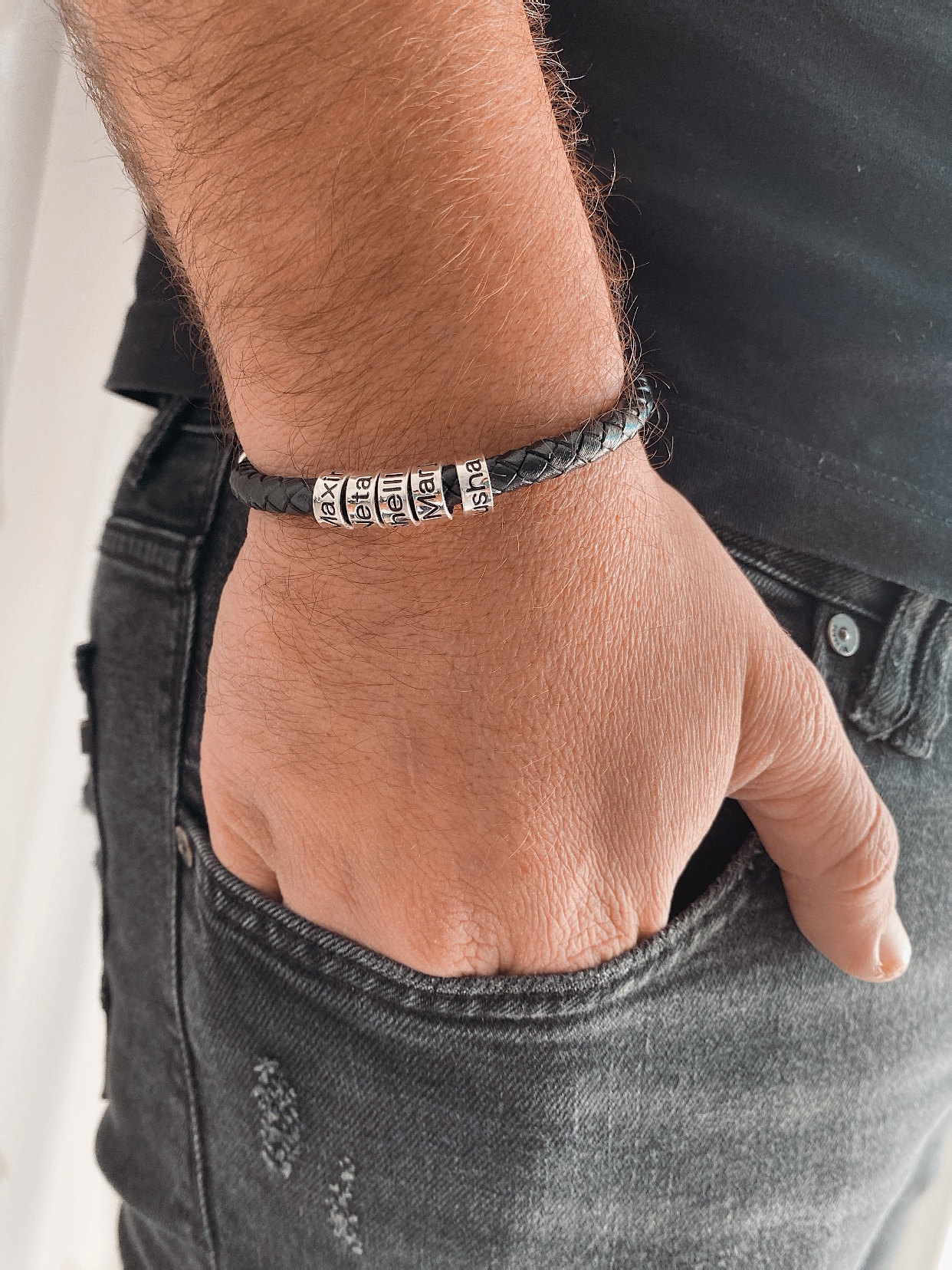 צמיד חרוזי חריטה עשוי מעור אמיתי איכותי, בצירוף חרוזי כסף אמיתי 925 עם חריטה אישית למראה מושלם,