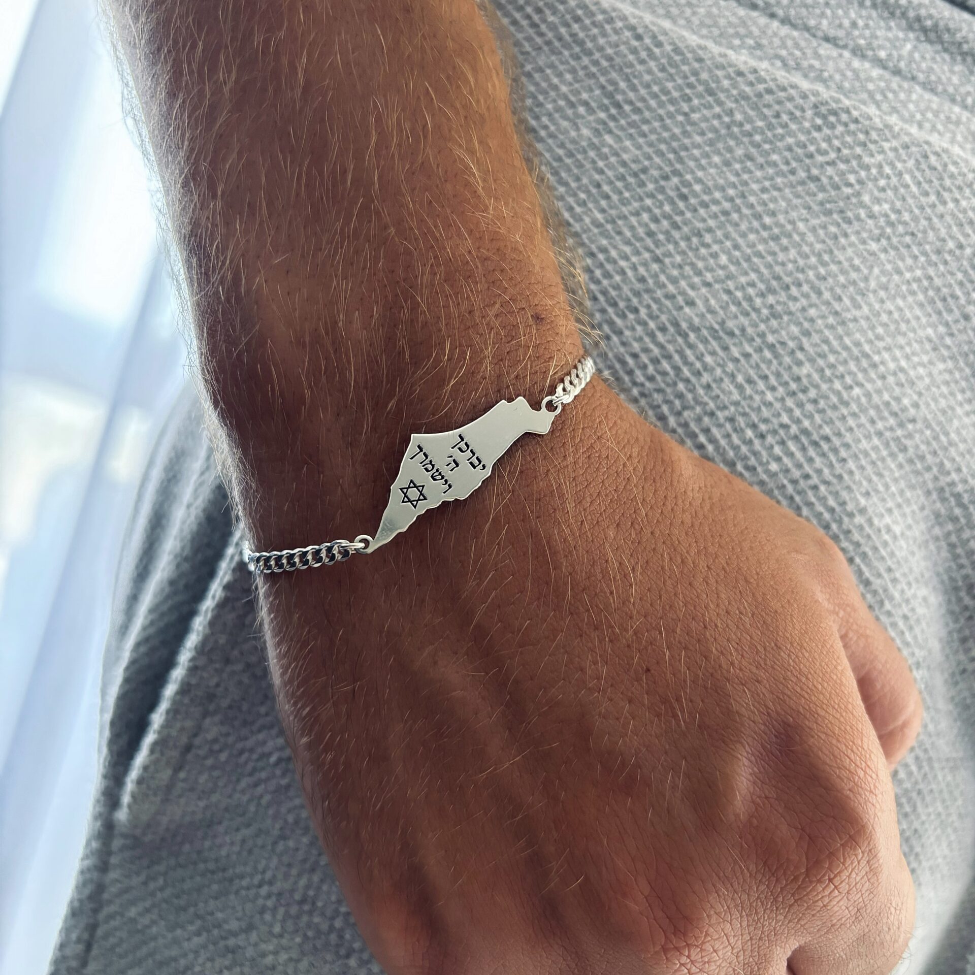 צמיד חריטה מכסף אמיתי 925 עם מפת ארץ ישראל וחריטה של "יברכך ה' וישמרך".